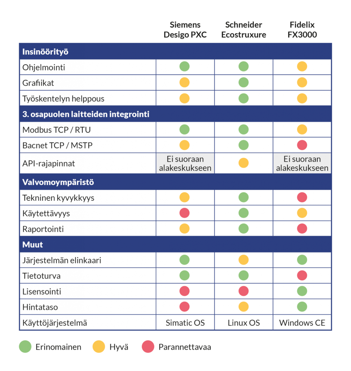 Fidelix on suurimmaksi osaksi kotimainen ja sen saatavuus on ollut myös pandemia-aikana hyvä. Tietoturvan suhteen taas Schneider ja Siemens menevät Fidelixin ohi.